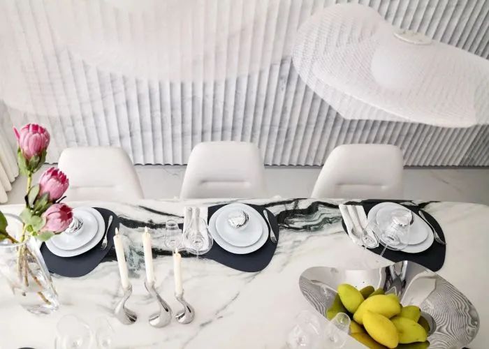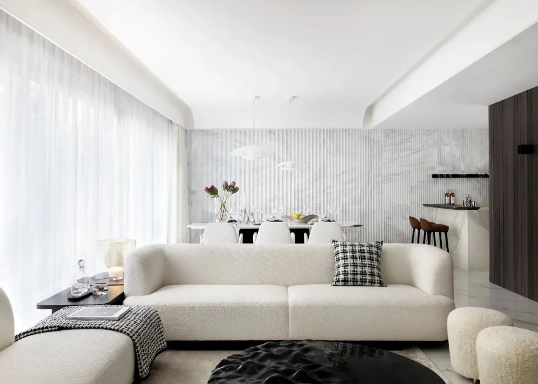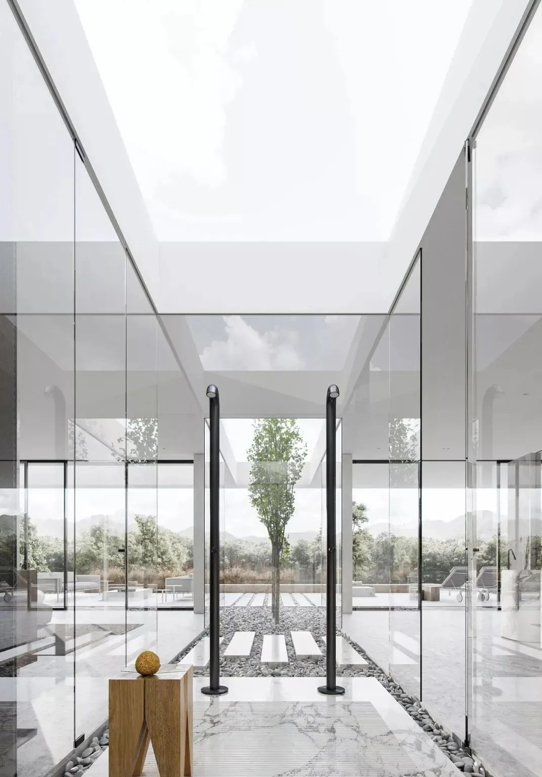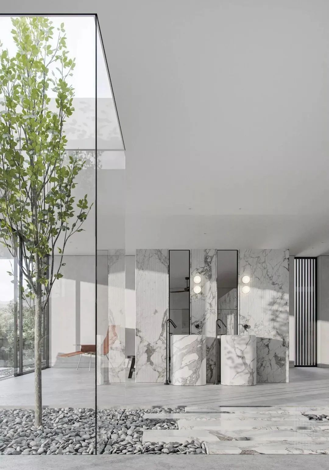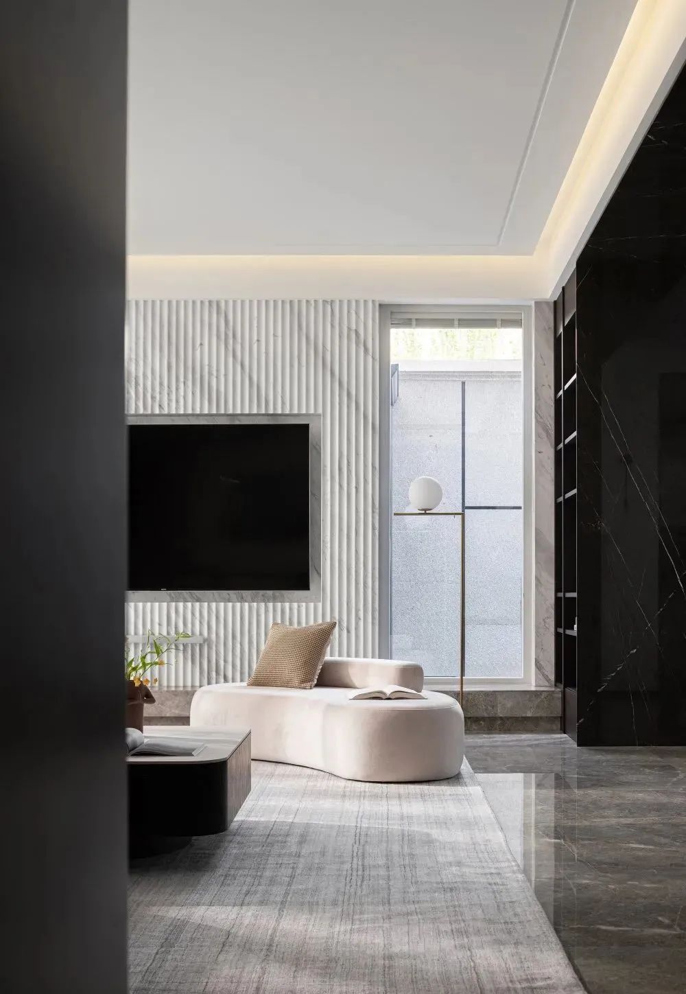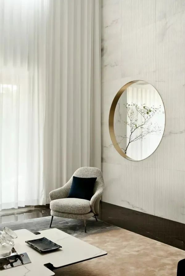石材拉槽天然獨特的紋理加上格柵線條的剛毅,更加的輕奢時尚,構(gòu)成整潔、大方、有品位的空間。