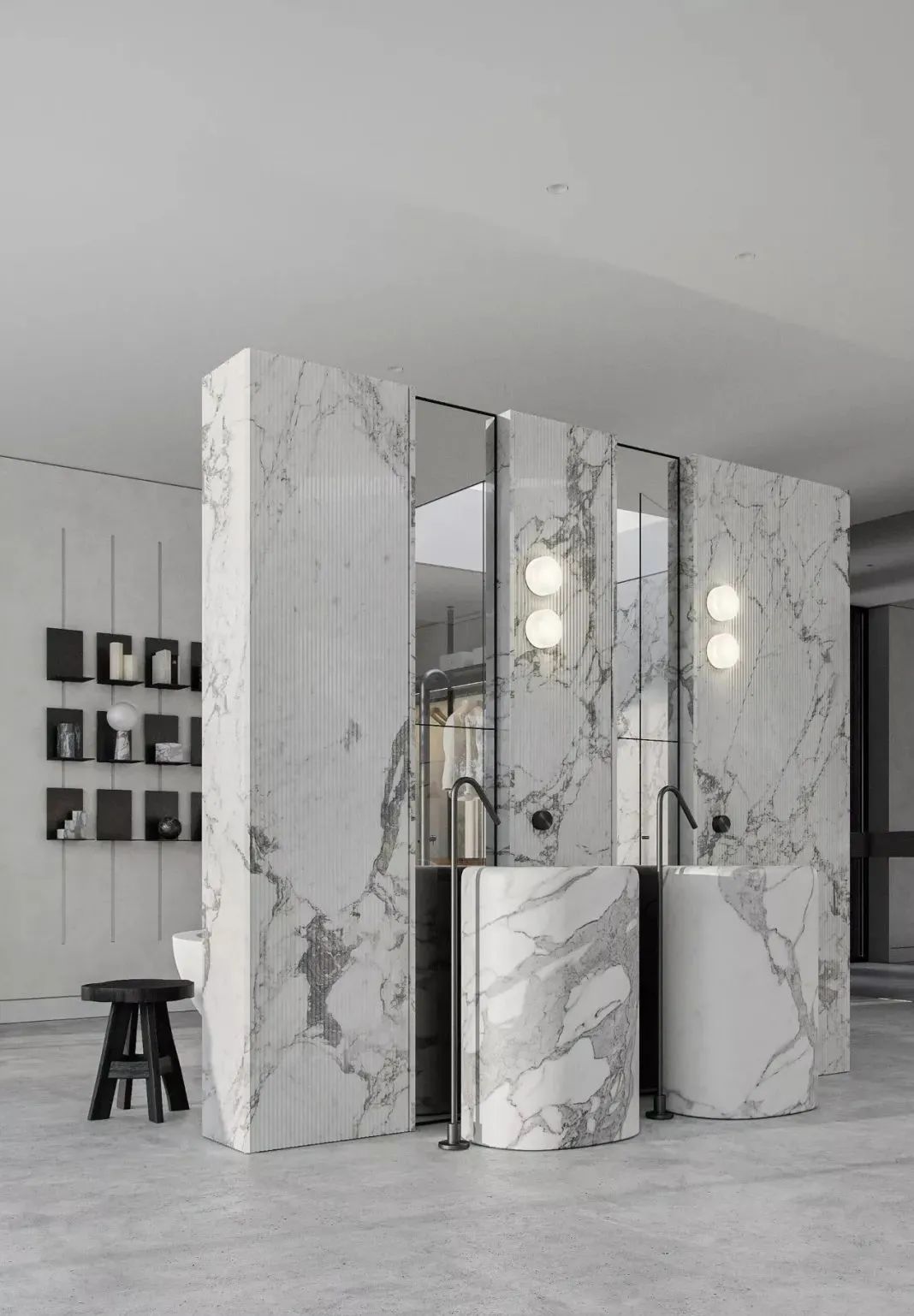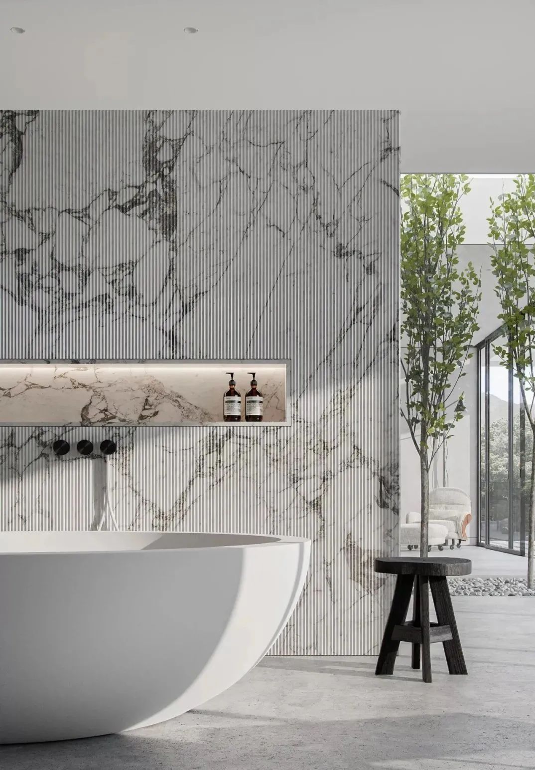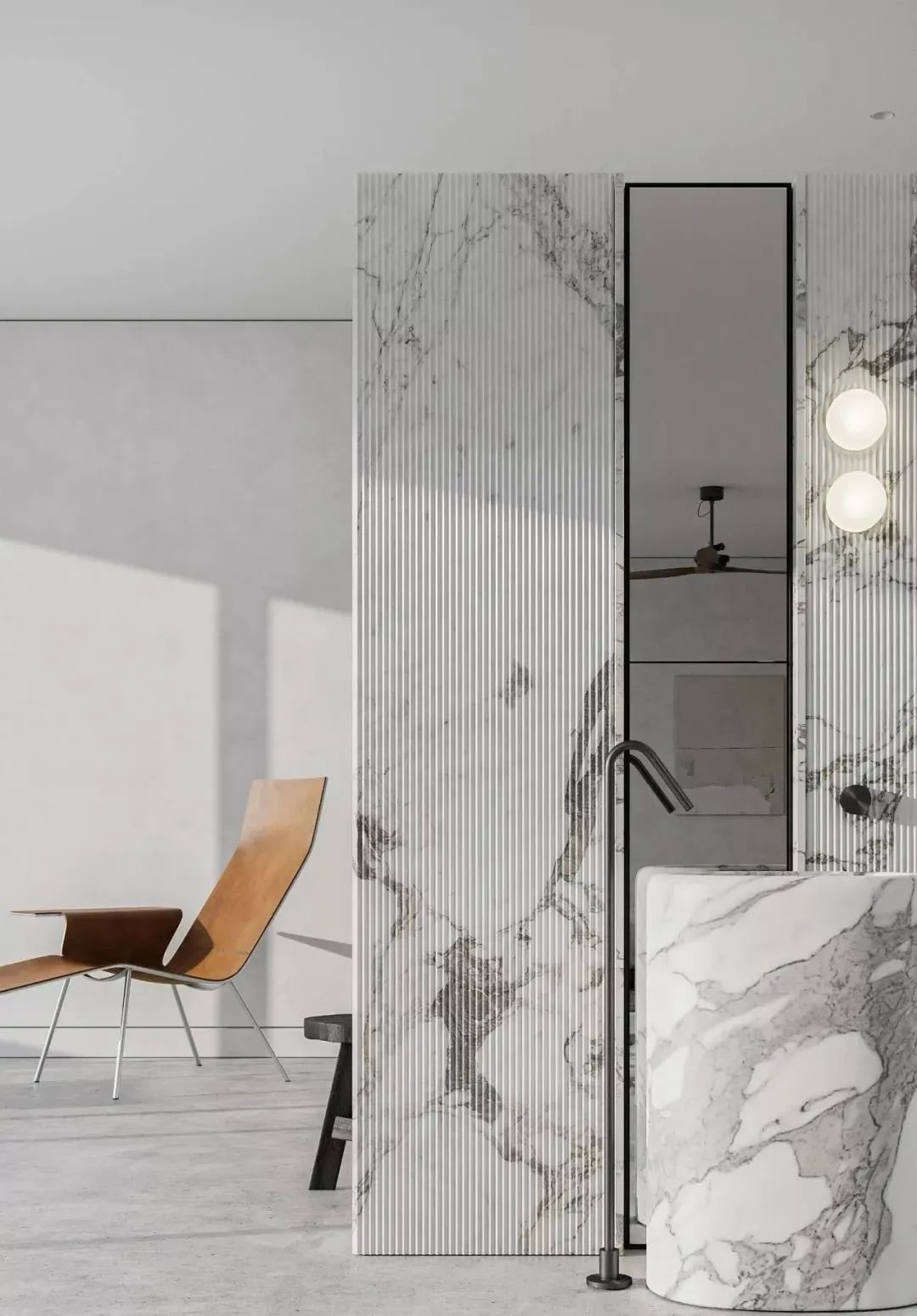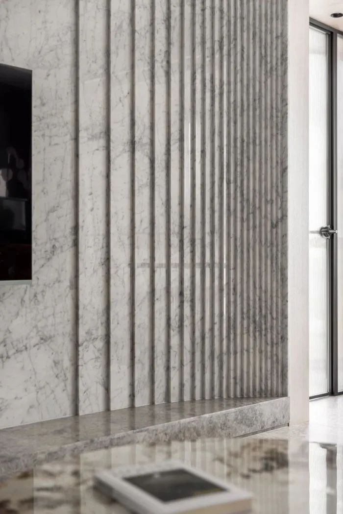 我們之前最常見的石材拉槽,就是衛(wèi)生間的淋浴板了。自從格柵背景墻火了之后,大理石墻面拉槽設(shè)計也開始更多進(jìn)入大家的眼簾。